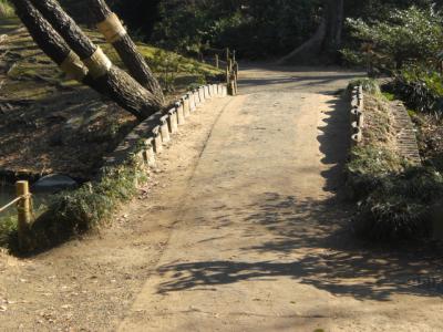 六義園の田鶴橋は、池の中心の中の島に直接かかる橋(土の橋)です。