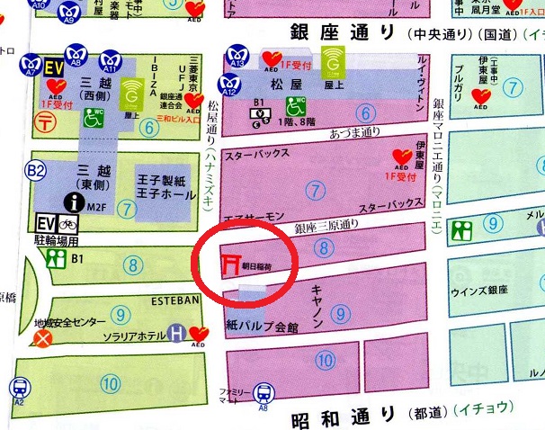 松屋通りを昭和通り方向に歩き、昭和通り近くになると、右手に王子製紙本社があり、銀座朝日ビルの横の角に、朝日稲荷神社が見えます。