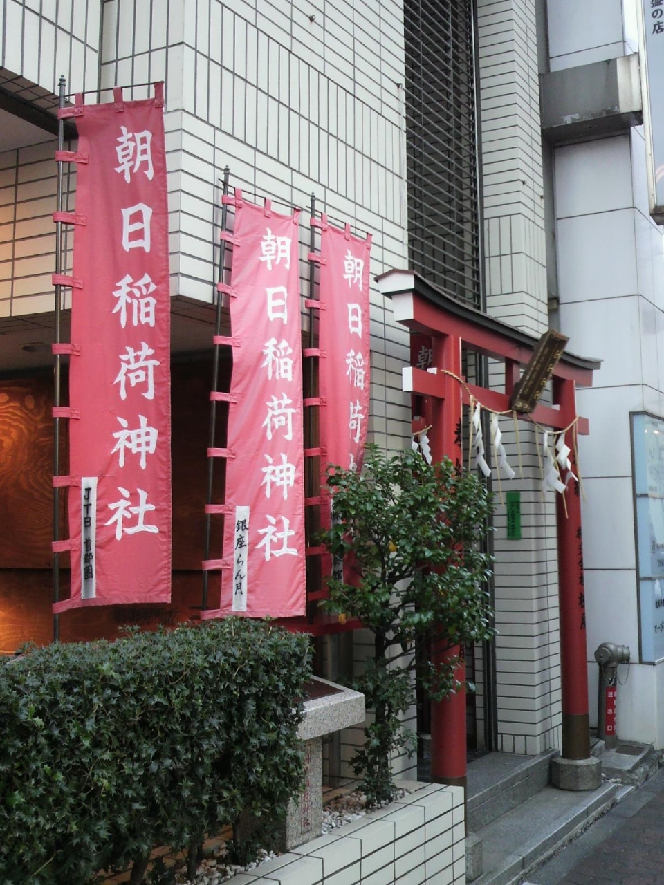 銀座の王子製紙本社の斜め向かいの角に、朝日稲荷神社があります。