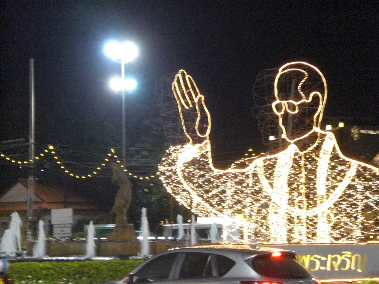 現国王ラーマ9世を形作ったイルミネーションは、夕方になって点灯され、綺麗な光の宴の場となっています。