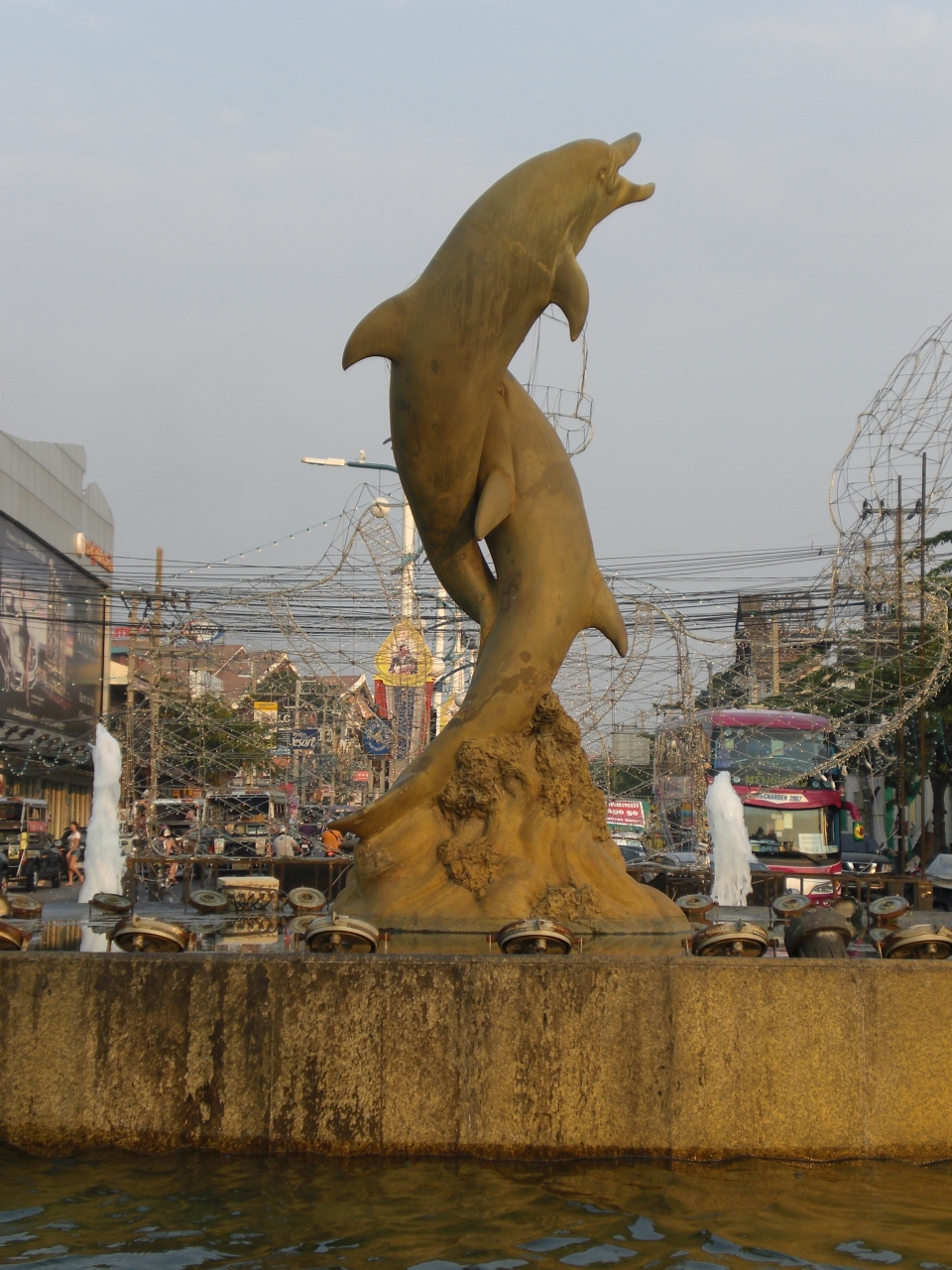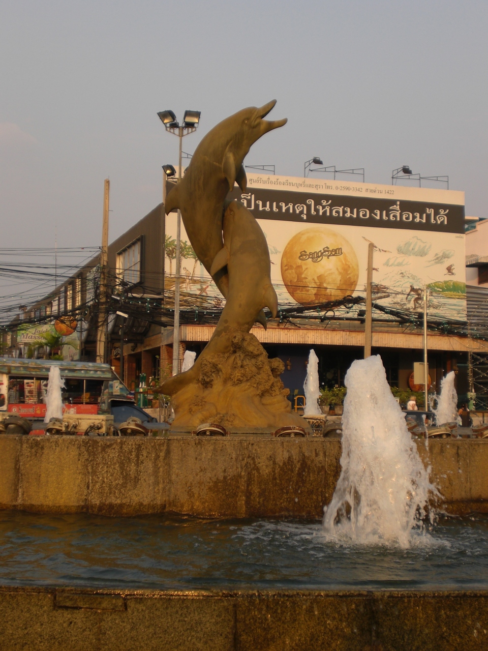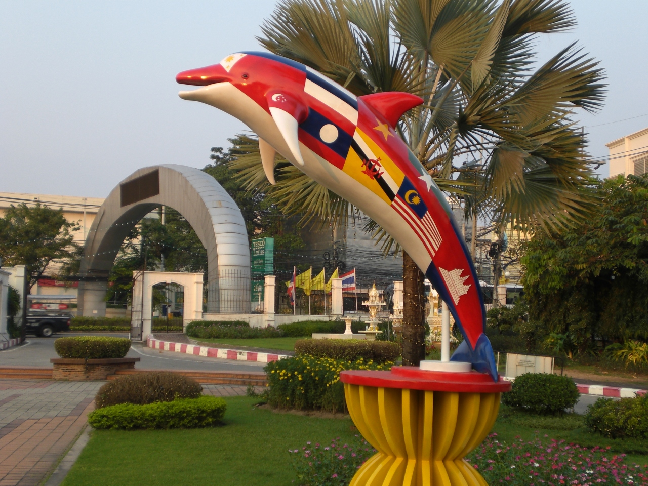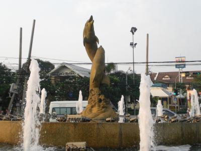 広場の東側には、アセアンの会議が開かれたのでしょうか、アセアン10ケ国の国旗があしらわれたイルカの像が建てられています。