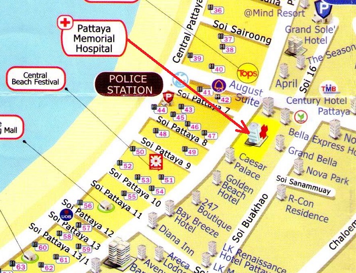 この病院は、セカンドロードとパタヤセントラル通りという市内の中心街にある場所の病院です。