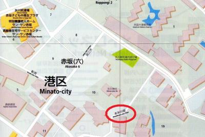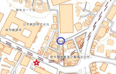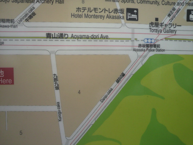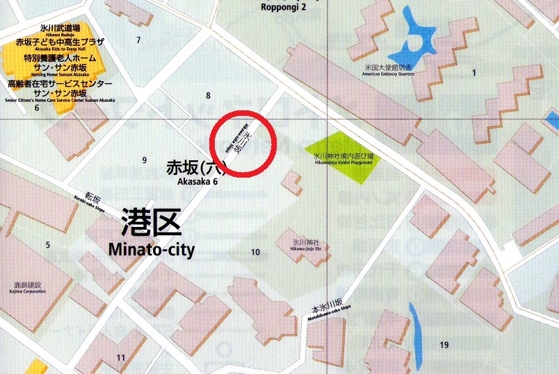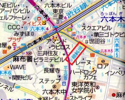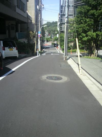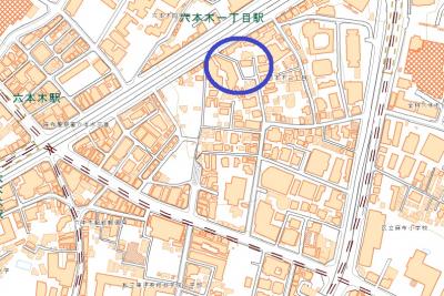 六本木交差点から外苑東通りを500mほど行きますと、南側に坂が下りて行きます。