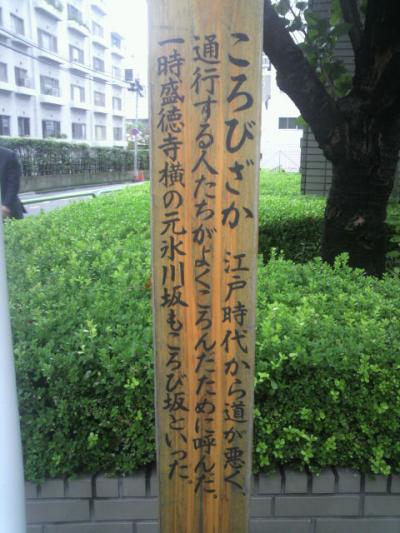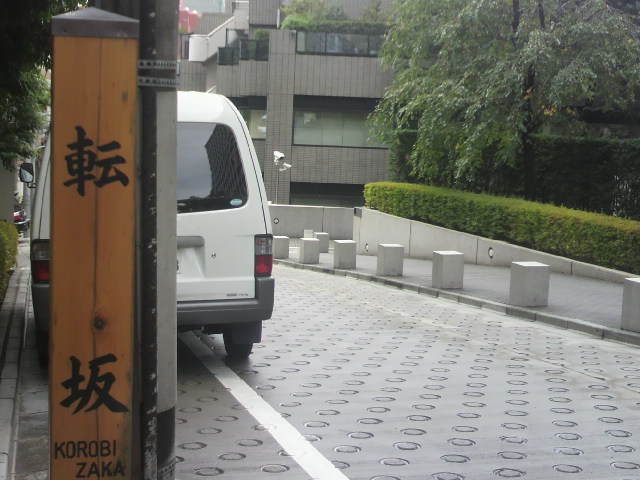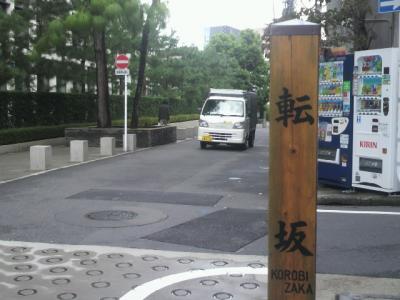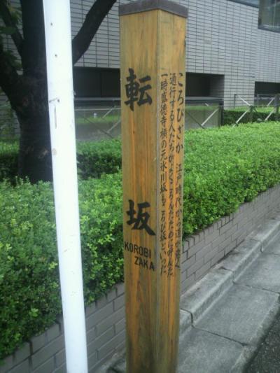 転坂は、赤坂6丁目にある坂で、昔の路面は悪く、転んでしまう人が多いことから転び坂と言われるようになったとのことです。