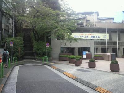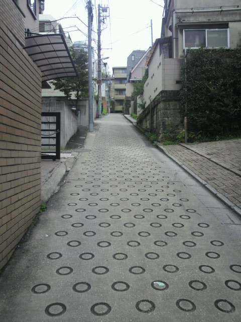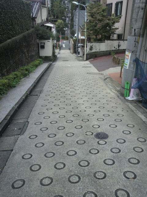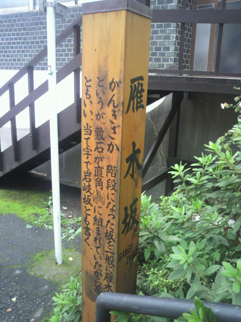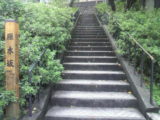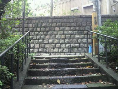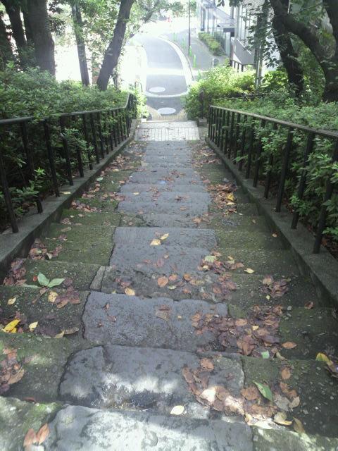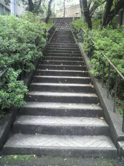 桜田通りから霊友会会館への道を入り、会館の前の広場を過ぎると、道の正面に、雁木坂の階段があります。