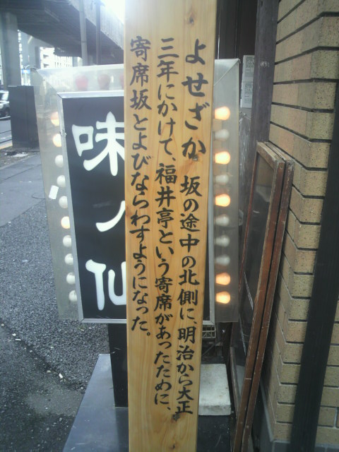 標識柱の説明によると、明治から大正にかけて、坂の途中に福井亭という寄席があったことから、寄席坂と呼ばれるようになったとのことです。