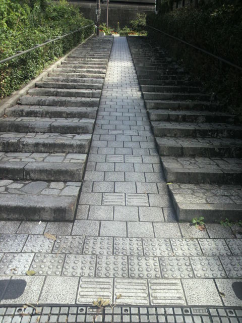階段があり、中央に車止めがある坂なので、車は通ることが出来ません。
