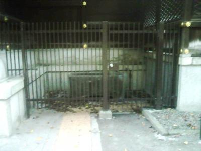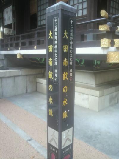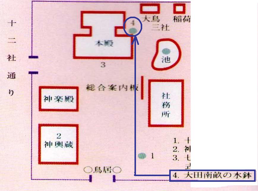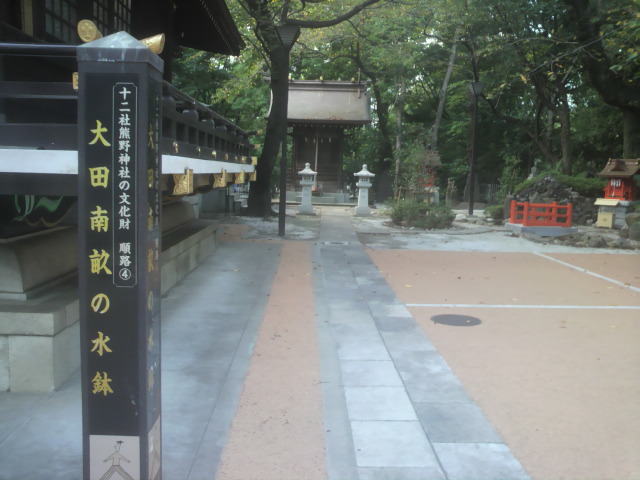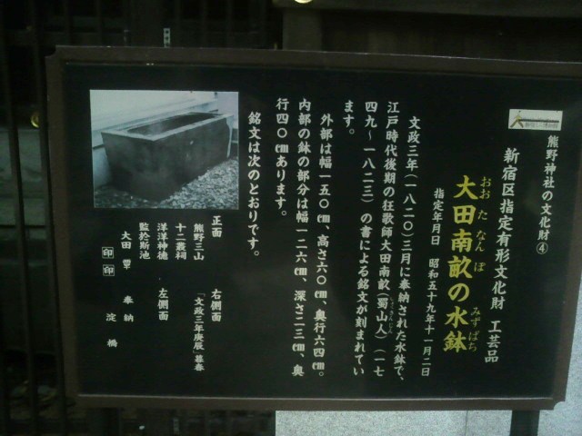 新宿中央公園の西に熊野神社があり、その本殿の東側に、大田南畝(蜀山人)の書による銘文が刻された水鉢があります。