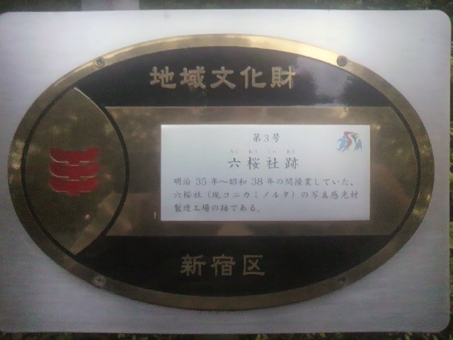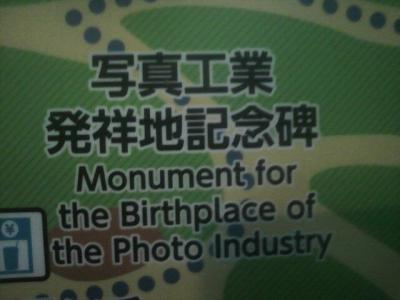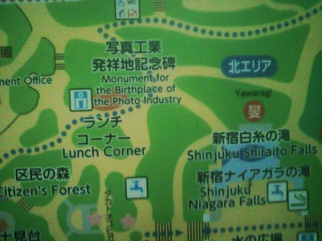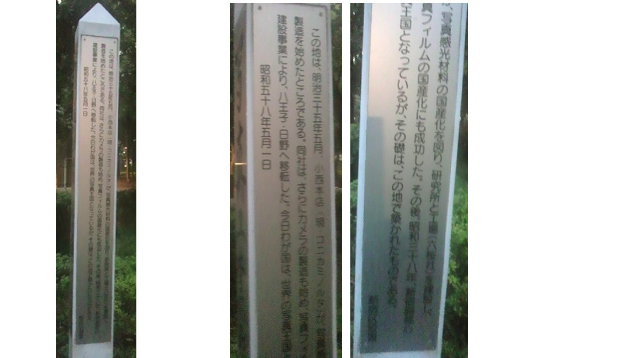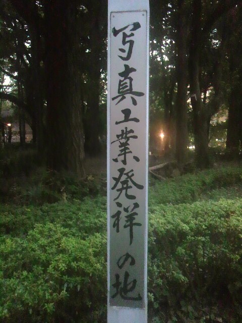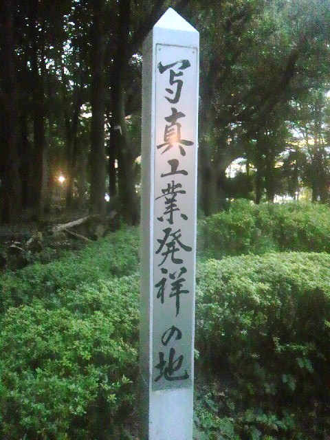 写真工業の発祥の地であるとの標識柱が、新宿中央公園の中に立てられています。
