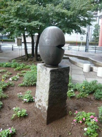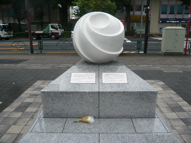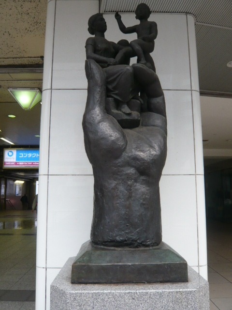 東口の階段を上がり切って地上部分に出たところにある像です。