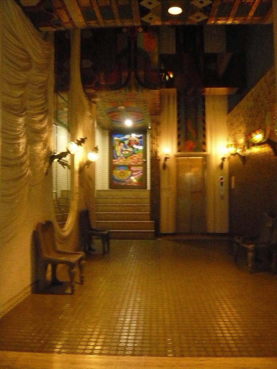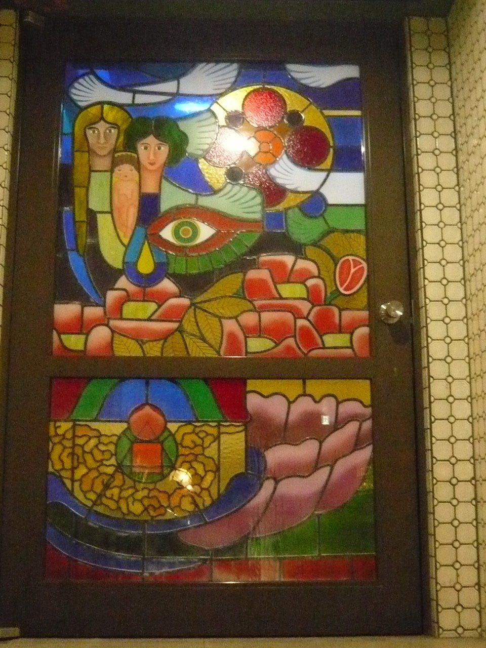 本来は、酒屋さんが主体のビルなのですが、1階は、ステンドガラスの鮮やかな色彩、天井や床のモザイクタイルの模様と精緻な装飾等に驚かされます。