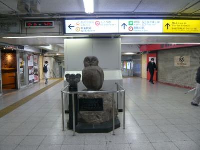 いけふくろう像は、池袋駅東口の構内北側の階段の前に設置されている待ち合わせに適した像です。