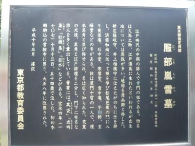 東京都教育委員会の解説板には、出生地や仕えた藩等について記載されているとともに、松尾芭蕉との関係についても詳述されています。