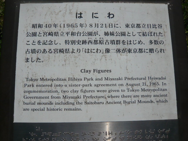 一対のはにわ像の間に、銅製の銘板があり、姉妹公園として結ばれたことを喜びとする旨の文章が記載されています。