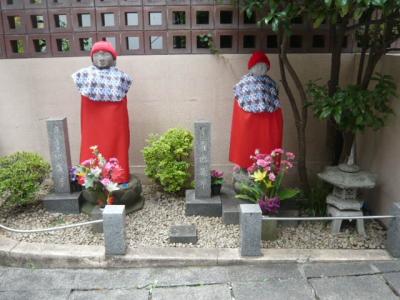 一ツ木通りから西に延びている比較的長い参道の入り口には、赤色の神明や赤色の布をまとったお地蔵さまがおかれていて、浄土寺の存在は、容易に判ります。