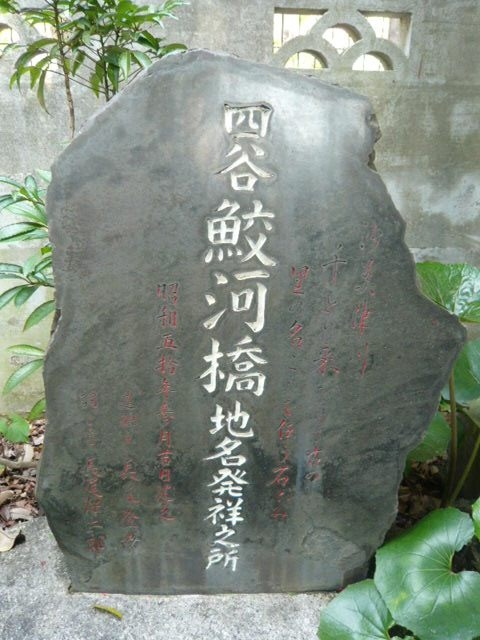 昔の四谷は、江戸湾が入り込んでいて、鮫が遡上してくる入江で、鮫が遡上する川に橋があり、鮫ケ橋河と呼ばれていました。