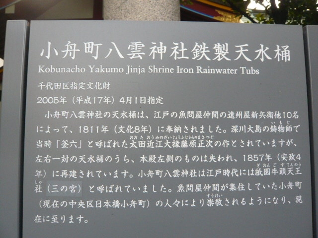 祭神も、建速須佐之男命ですが、大伝馬町八雲神社のもともとの場所が、江戸城外にあったものを、神田明神に遷座したようで、小舟町八雲神社が江戸城内にあったものを、神田明神に遷座したことの差異があるようです。