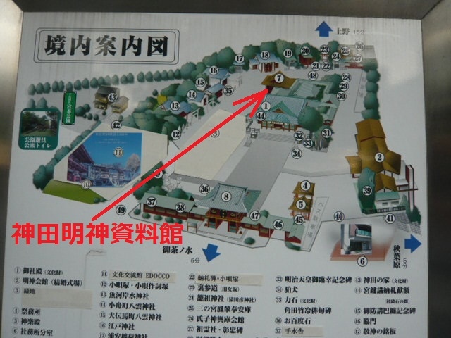 資料館は、神田明神の西側にあり、入口は、江戸神社の向かいにあるため、江戸神社を目印に行くと、迷うことも無く、かえって早いかもしれません。