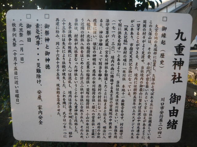 九重神社は、平将門が砦を築いた久保山と呼ばれる安行一番の高さの台地に位置しています。