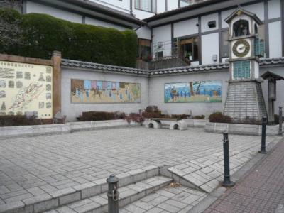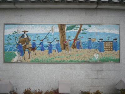 御成坂公園の壁には、将軍の日光御成の様子をタイル張りの絵図にして、紹介されています。カラーのタイル絵図ですので、色鮮やかに見えます。