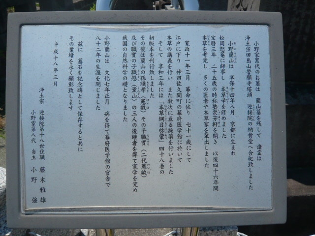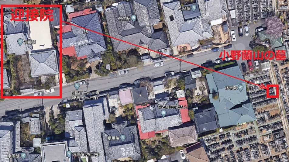 小野蘭山の墓所が、練馬十一ケ寺の迎接院の墓地区画に収められています。