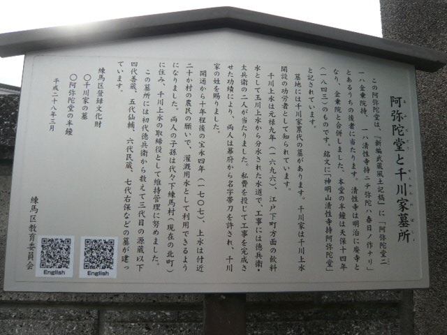 千川上水の開削に尽力した千川家の墓が、東武練馬の駅の東南の阿弥陀堂の墓地にあります。