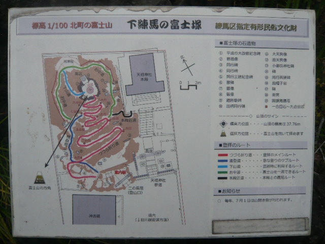 下練馬の富士塚は、標高37.76mで、富士山の3,776mと符合させています。もって、富士山登山を成就したことと見なしたのです。