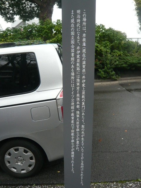 梨木坂は、彦根藩の敷地に隣接していたこともあり、明治維新後、陸軍省や陸軍関係の施設が設置されたようです。また、ドイツ大使館等もこの地に、入っていたとのことです。