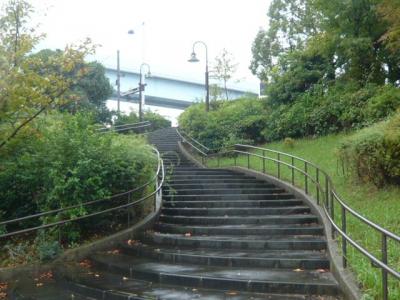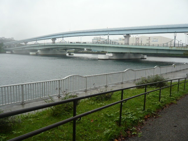 東側は、有明埠頭橋付近で公園の通路が途切れるため、一端、一般道路に出る必要があります。
