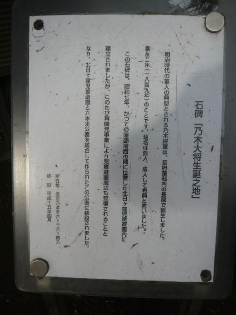乃木大将誕生の石碑は、乃木大将の殉死後、昭和7年に、誕生地であった北日ケ窪の藩邸の跡の北日ケ窪児童遊園内に建てられました。