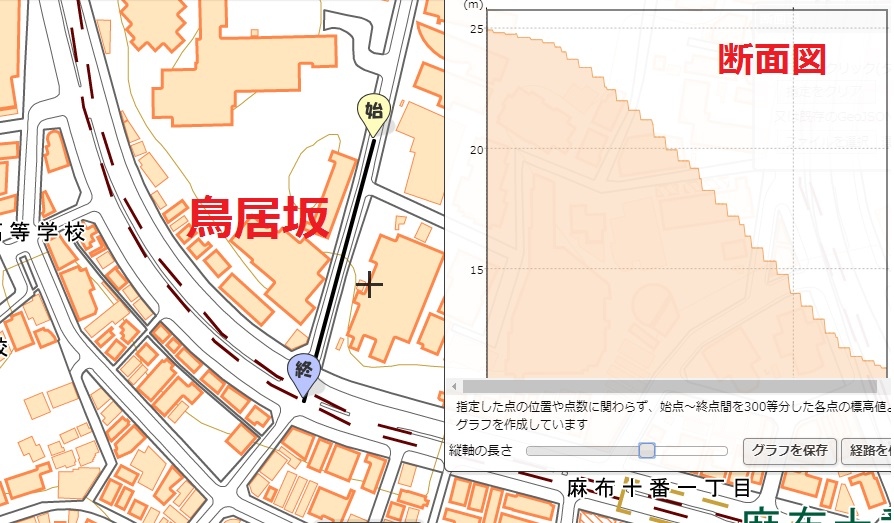 国土地理院の断面図から見ると、約120mの坂で、15m標高差がありますので、鳥居坂の勾配は、約13%となります。