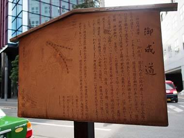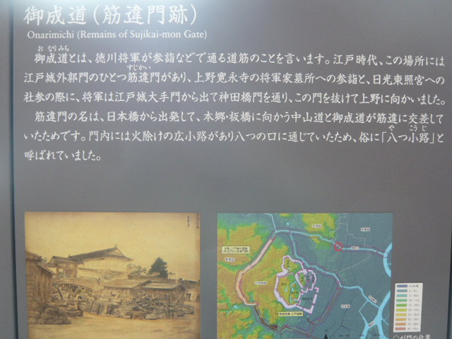 昌平橋と万世橋の中間に御成道の解説板があります。中山道との交点の筋違門跡の場所です。