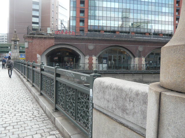明治5年、最初の万世橋が、筋違御門の撤去で不要となった石垣の石で、現在の万世橋の上流150mに位置に、架けられました。(多分、筋違御門橋の位置?)