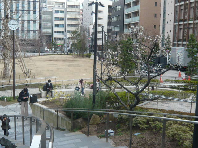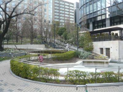 淡路公園は、駿河台の東斜面にあるため、西から東に、順次、階段状の区画になっていて、それぞれ道路や植栽で段差を意識しないように設計されています。