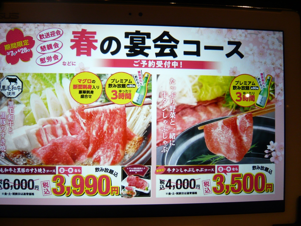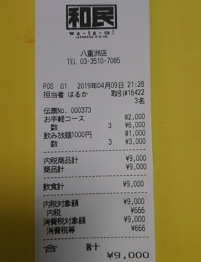 その時は、生ビールを2~3杯飲んで、料理を2~3皿注文して、一人4000円程度でした。