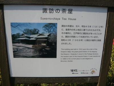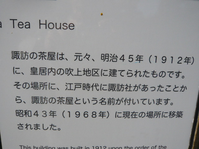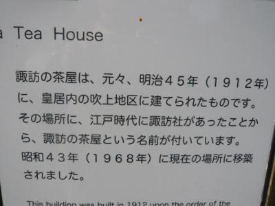 諏訪の茶屋としての建物は、明治45年に建築されたもので、昭和43年に、皇居東御苑の整備の際に、吹上御苑から移築されました。