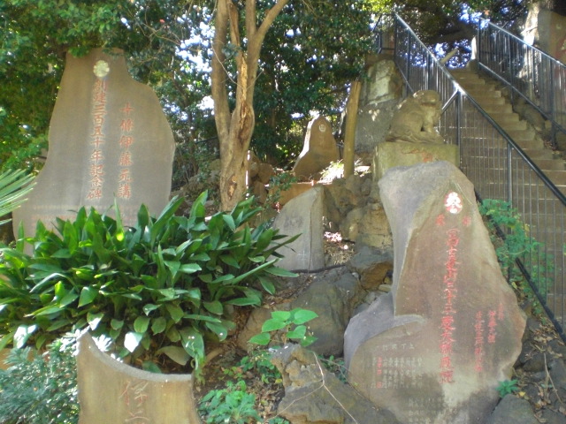 富士塚の祠に上がる階段の両側には、数多くの富士講の石碑が置かれています。