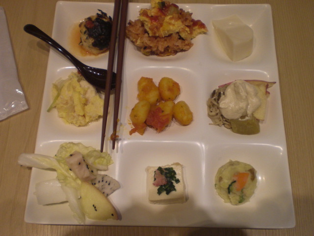 お皿が、少しずつ取って、味合うような形になっていて、多数の種類の料理を、少しずつ味わうようになっています。