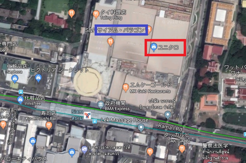 サイアムパラゴンは、BTSサイアム駅のすぐ北側にあり、その中に、ユニクロがあるという構図です。