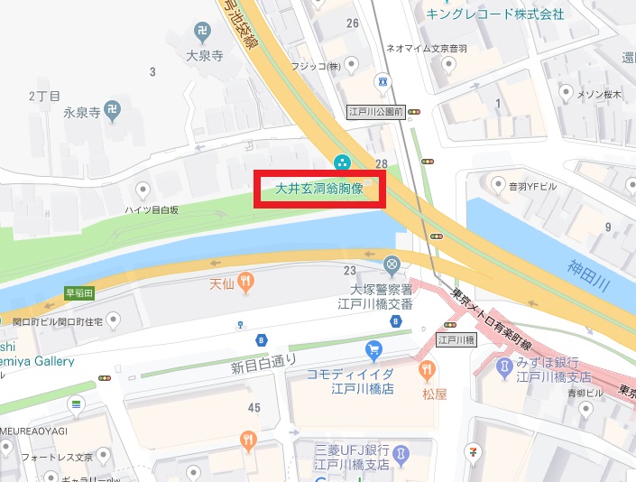 それらの功績により、胸像が神田川の北岸に置かれています。
