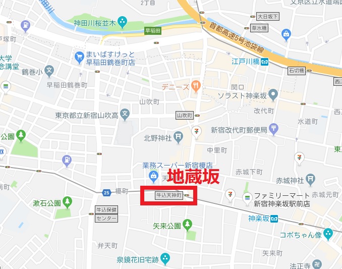 地蔵坂は、神楽坂方面に曲がる手前付近です。