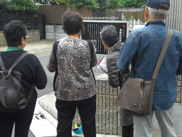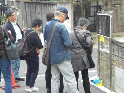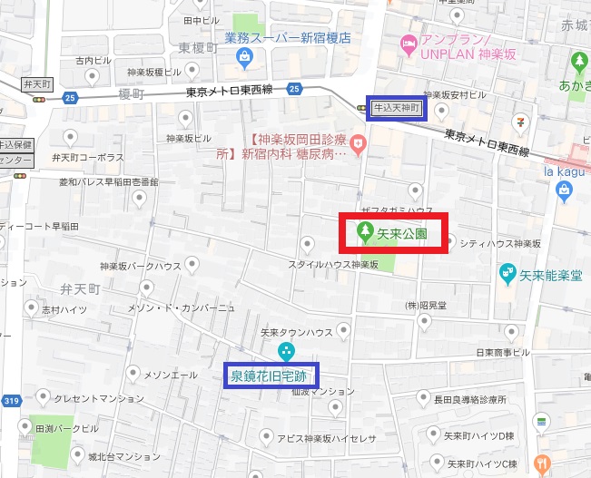矢来公園の南西側には、泉鏡花の旧居跡があり、見学ツアーの一環で訪れる人たちが散見されます。