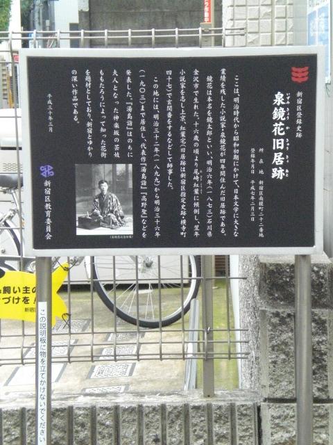 新宿区教育委員会の泉鏡花旧居跡に関する解説板が、南榎木町に立てられています。
