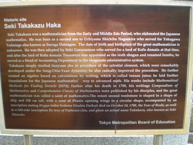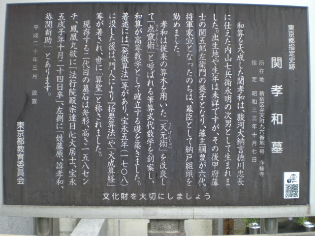 関孝和の立派な墓と解説板により、関孝和の功績を理解することができます。