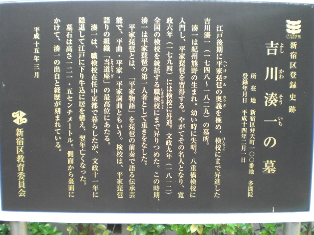 平家琵琶の達人として検校まで昇進した吉川湊一の墓が、弁天町の多聞院にあります。