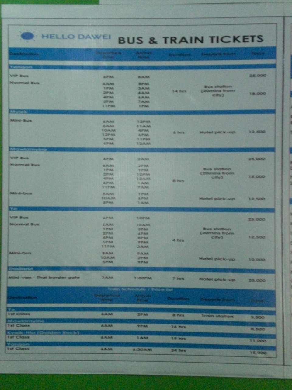 旅行代理店の表示には、ヤンゴンまでの鉄道料金が掲示されています。