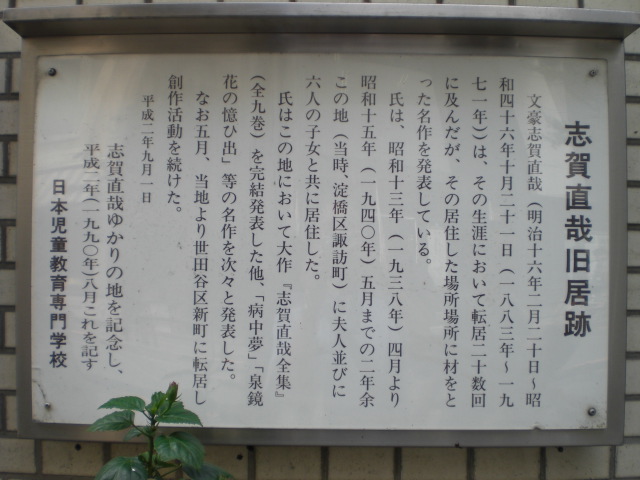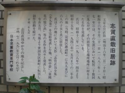 標識の解説文には、志賀直哉の居住した住居が、記されています。