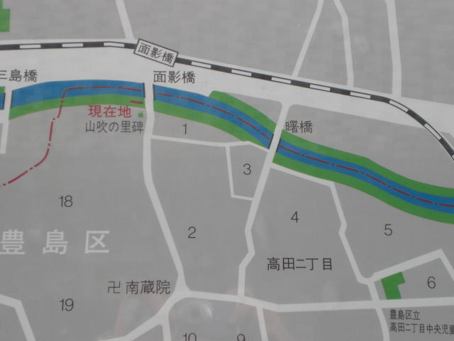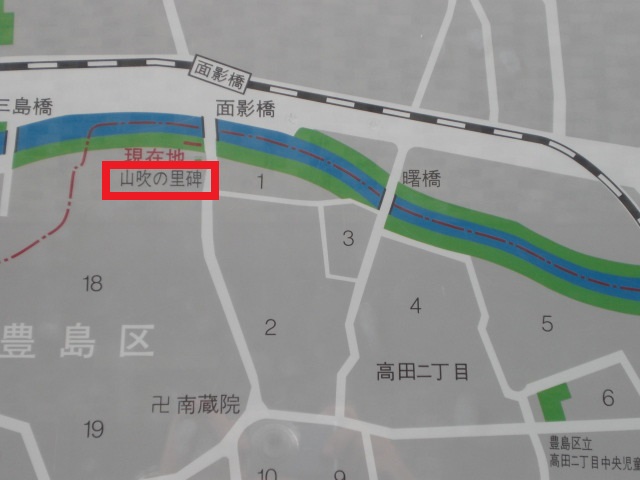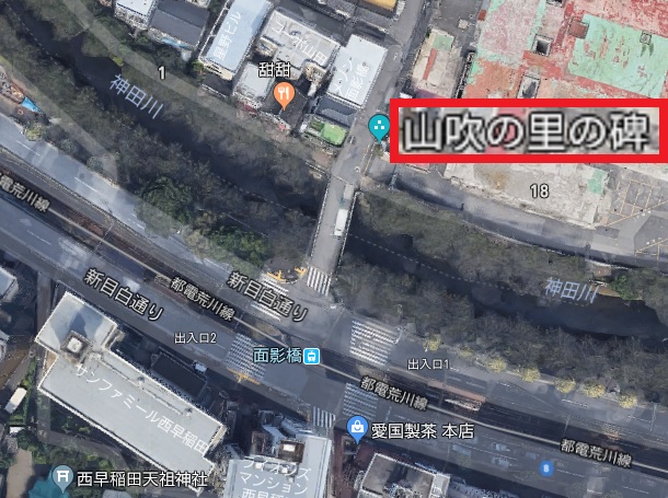 面影橋の北側には、太田道灌の逸話にある山吹の里の碑があり、有名な場所とされ、江戸時代・明治時代には名所のひとつであったそうです。