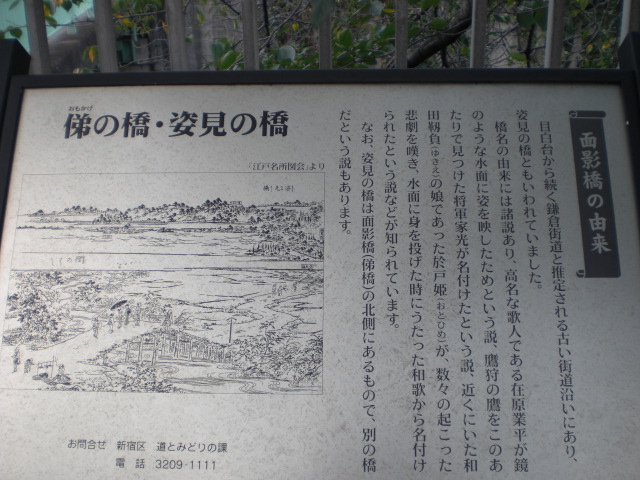 面影橋の名称としては、「俤の橋」(おもかげばし)とも「姿見の橋」とも呼ばれるとことですが、橋の親柱には「面影橋」と記載されています。