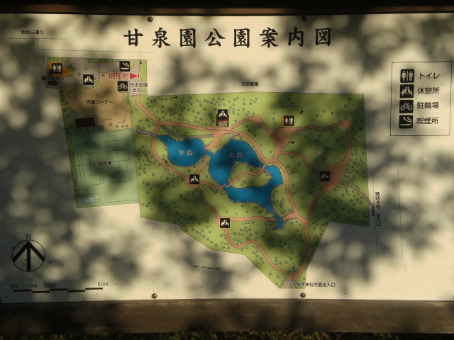 甘泉園公園は、湧き出る清水を活用した上池・下池を中心に、周辺に遊歩道を巡らせ、北側には、東屋を配しています。